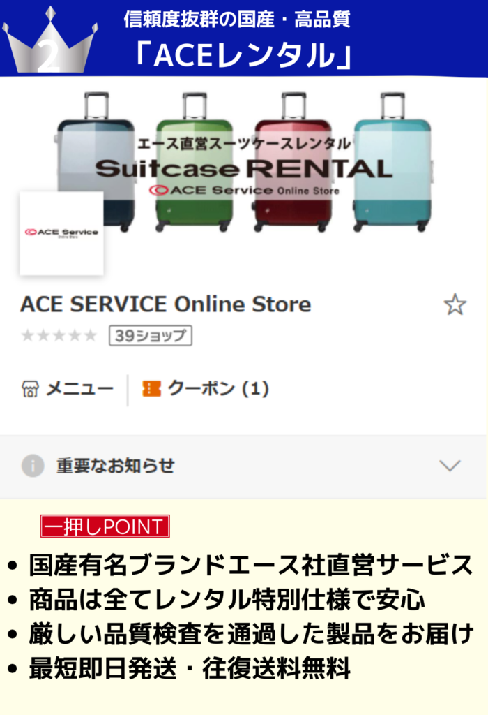 ACEレンタルは国産スーツケースメーカーACE社の直営レンタルサイトです。