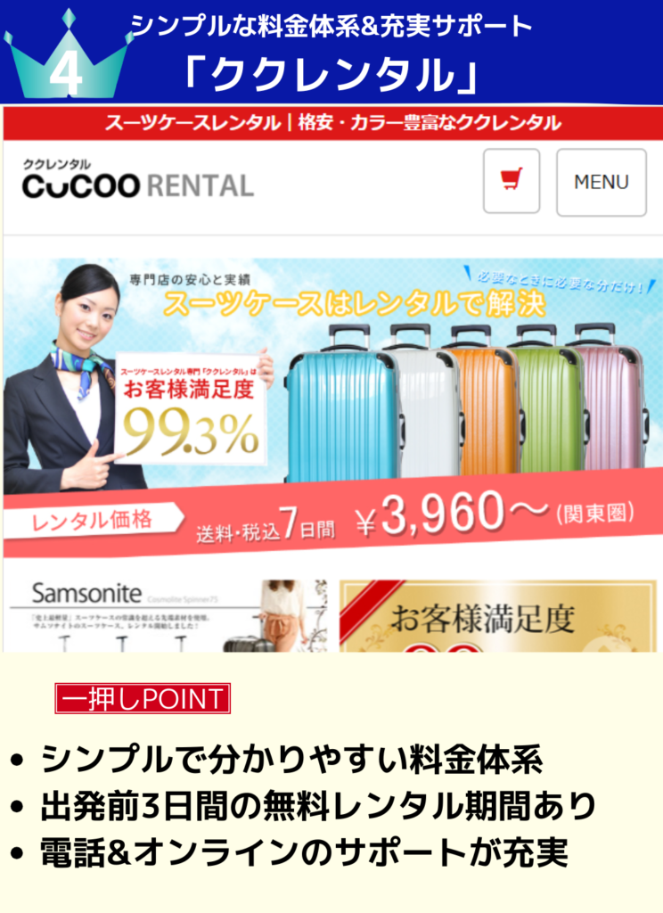 自分自身一回の出張のために新しくスーツケースを買うのはあまりしたくなかったので、レンタルということができたのでとてもよかったです。