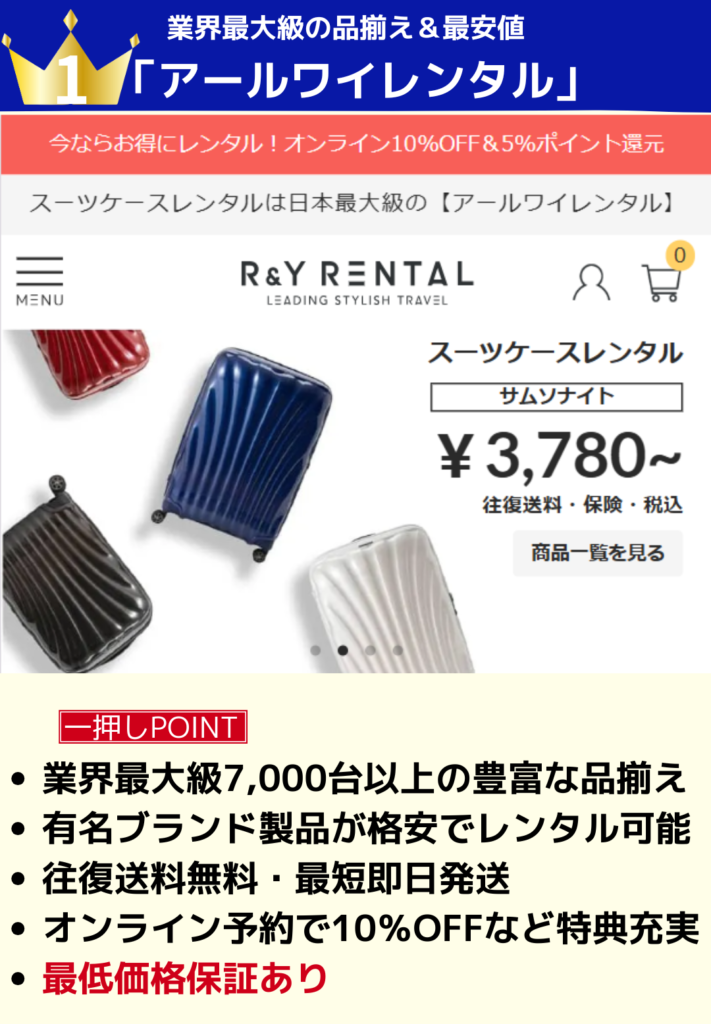 アールワイレンタルは利用者数国内No.1のスーツケースレンタルサイトです。